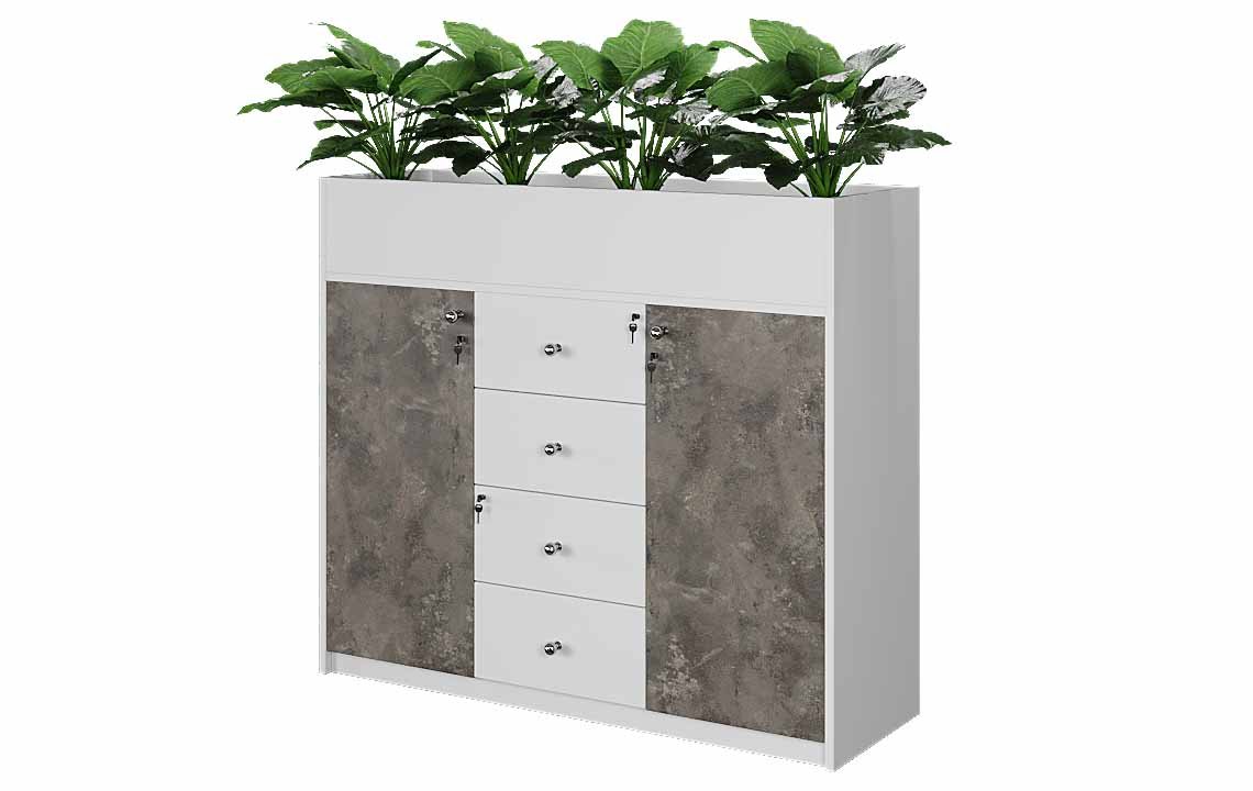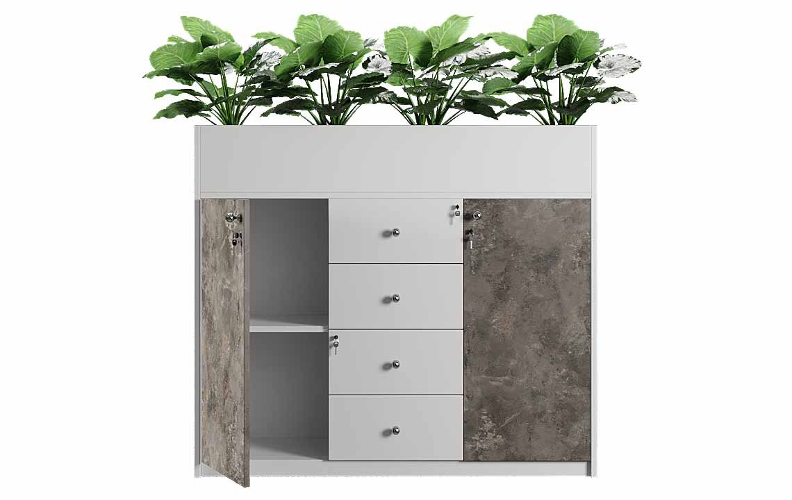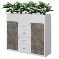 Introducing the Cabinet – 033 Low Height Planter from Highmoon UAE, beautifully crafted from Melamine faced MDF with a wooden finished MFC. This lockable cabinet features four drawers and two rows of storage, complete with chrome-finished metal knob handles and soft-closer hinges for smooth, quiet operation. Its unique design includes a top section designed to house plants, adding a touch of nature and tranquility to any office space. Ideal for those seeking functionality and style with a green twist.